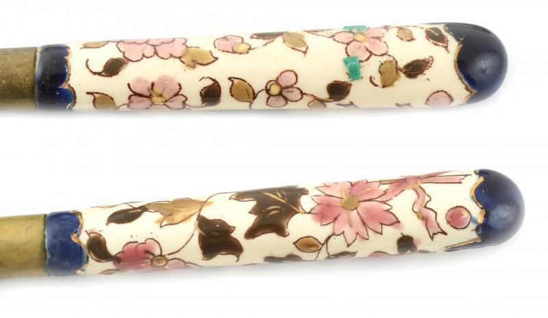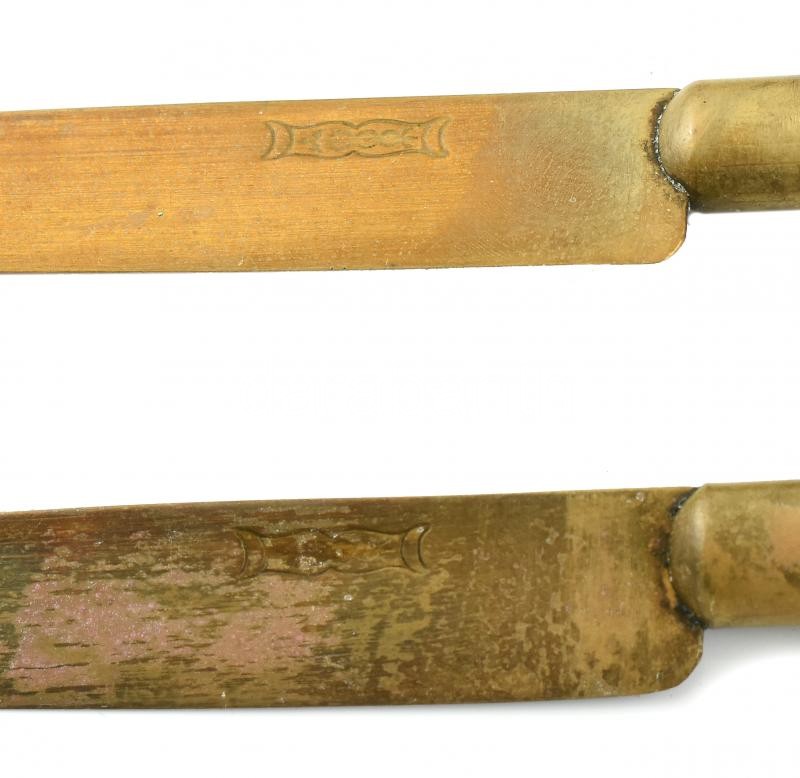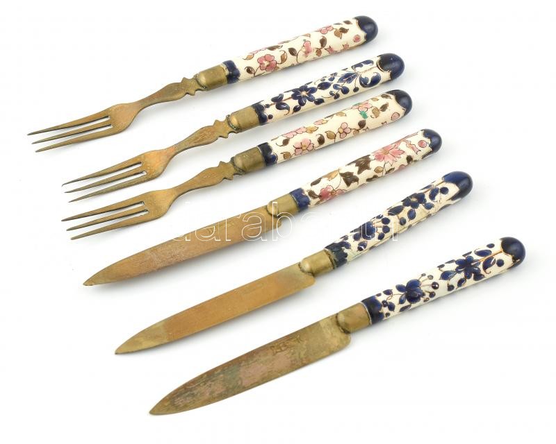 3-3 db porcelán nyelű kés és villa réz pengével, egyik sérült és javított, többi kopásnyomokkal, kisebb deformációkkal, h: 15 és 16 cm közötti méretekben