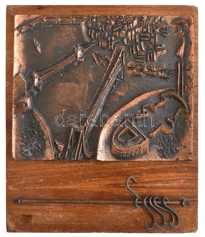 Beschreibung: Iparművész kulcstartó, Budapestet mintázó réz plasztikával, fa táblán, jelzés nélkül, 20x17 cm