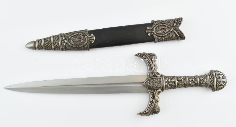 Beschreibung: Masszív fém fantasy tőr gazdagon díszített bőr és fém hüvellyel 43 cm