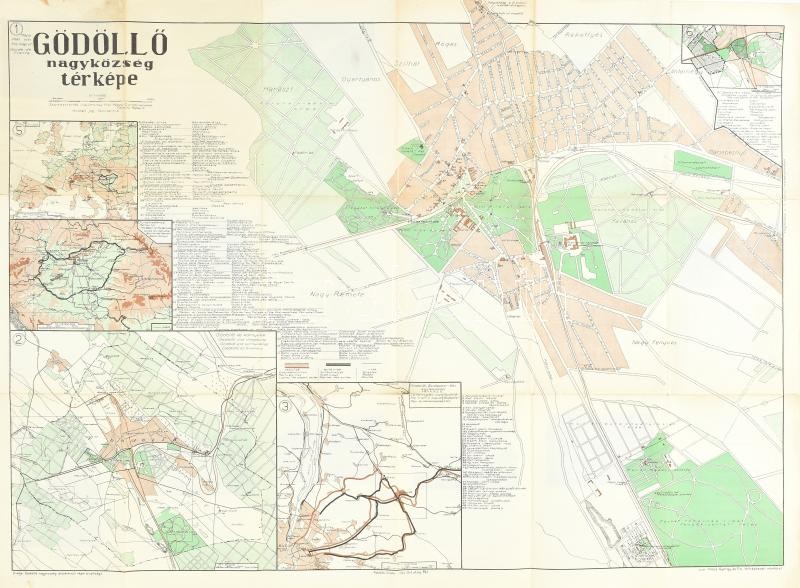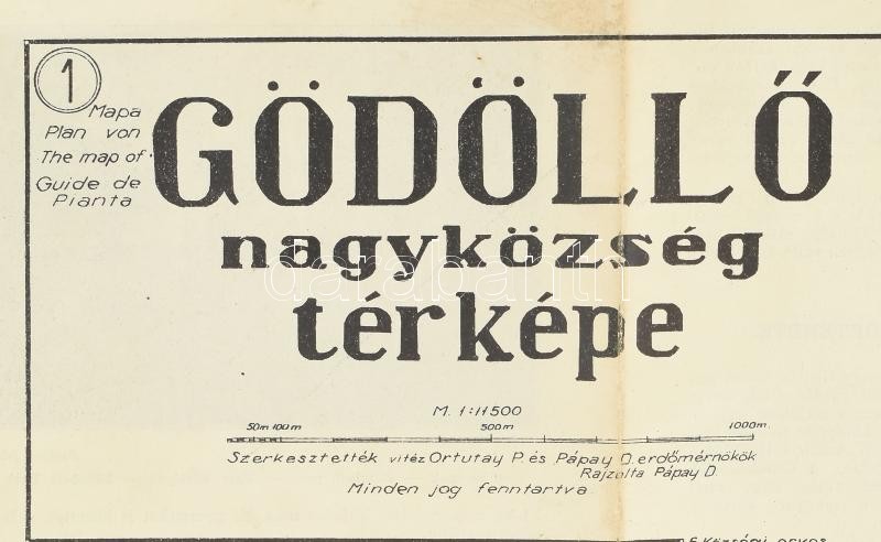 cca 1930-1940 Gödöllő nagyközség térképe, szerk.: vitéz Ortutay Pál és Pápay D., 1 : 11.500, Klösz György és Fia térképészeti műintézet, hátoldalán tárgymutatóval és képes ismertetővel, kisebb szakadással, foltokkal, 68,5x50 cm