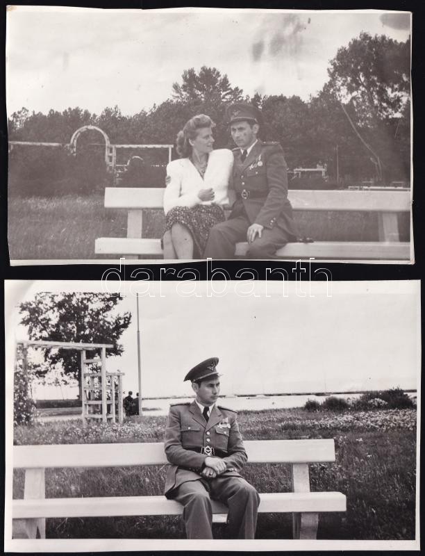 Beschreibung: cca 1940 Repülős hadnagy kitüntetéseivel, 2 db fotó, 8,5×14 cm