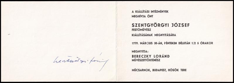 Beschreibung: Szentgyörgyi József (1940-2014) festőművész aláírása kiállítási meghívón