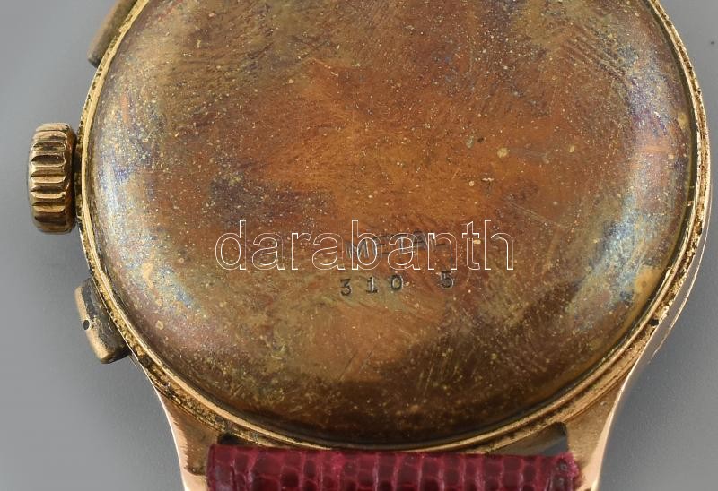 Beschreibung: Aureole kronográf 18K arany tokos, jelzett, 17 köves kézi felhúzós karóra, bőr szíjjal, számlap enyhén korrodált d: 35 mm. Működő állapotban. / Aureole 18ct gold maual winding watch with slightly corrosed dial