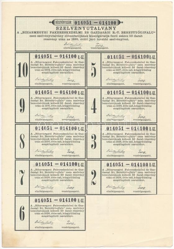 Berettyóújfalu 1923. "Biharmegyei Fakereskedelmi és Gazdasági Rt.... https://www.darabanth.com/de/403-Fernauktion/403.0/Numismatik/Aktien-und-Tickets~2500005/Berettyoujfalu-1923-Biharmegyei-Fakereskedelmi-es-Gazdasagi-Rt-Berettyoujfalu-50db-reszvC3~II2482461