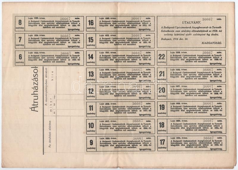 Budapest 1916. "Budapesti Czipészmesterek Anyagbeszerző- és Termelő-Szövetkezete" névre szóló részjegy 100K-ról, szelvényekkel, bélyegzéssel és szárazpecséttel T:III