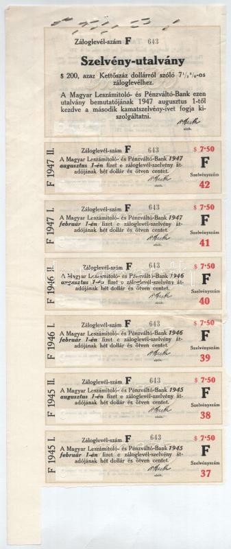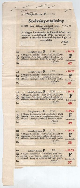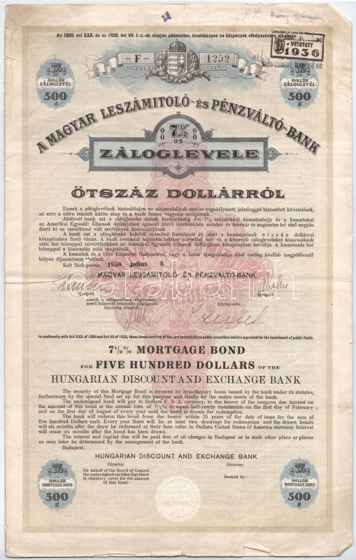 Budapest 1930. "A Magyar Leszámitoló- és Pénzváltó-Bank 7 1/2%-os Záloglevele" záloglevél 500$-ról, bélyegzéssel és szárazpecséttel + 1931. "A Magyar Leszámitoló- és Pénzváltó-Bank 7 1/2%-os Záloglevele" záloglevél 200$-ról, bélyegzéssel és szárazpecséttel T:III