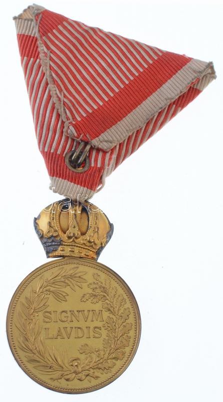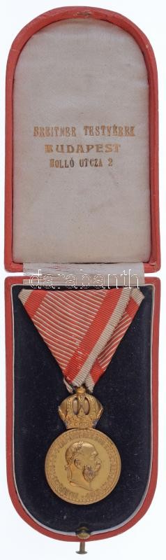 Hungary 1916. "Bronze Military Merit Medal on a war ribbon (Signum Laudis)" gold plated Br decoration with ribbon, in original, slightly worn "BREITNER TESTVÉREK BUDAPEST HOLLÓ UTCZA 2" makers case C:AU