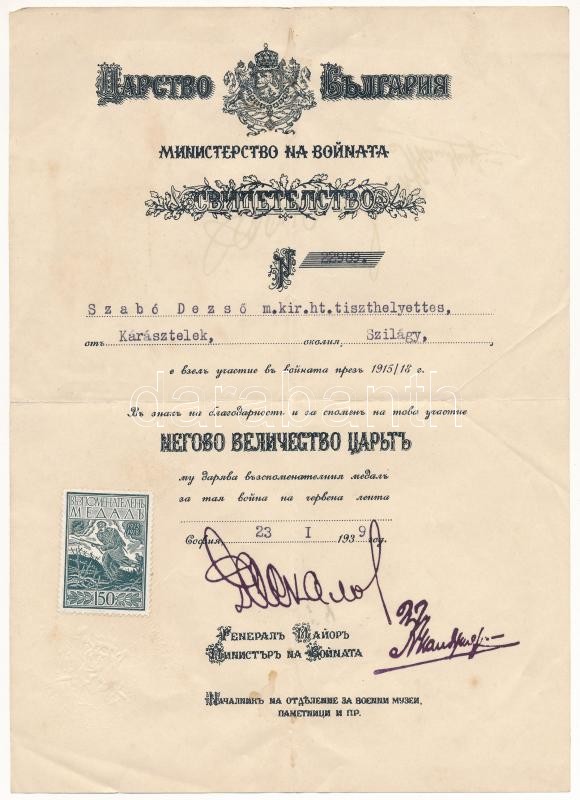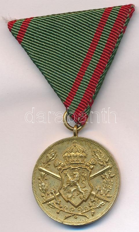 Bulgária ~1933-1939. "Európai Háborús Emlékérem 1915-1918" aranyozott Br kitüntetés mellszalagon, eredeti adományozói okirattal T:1-