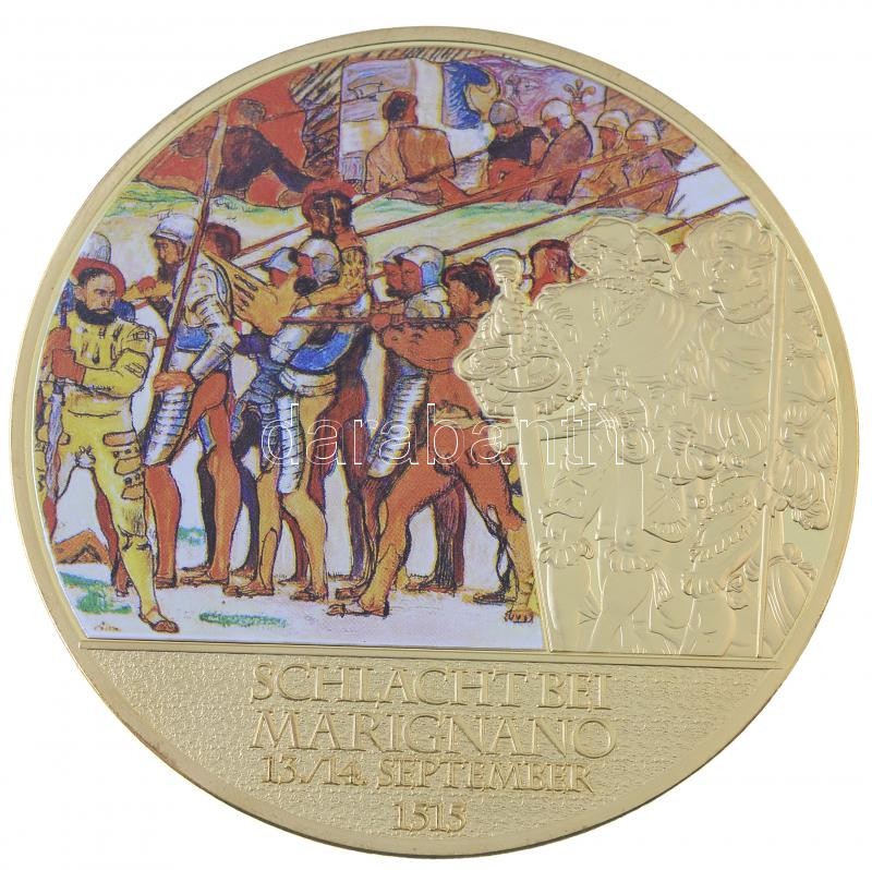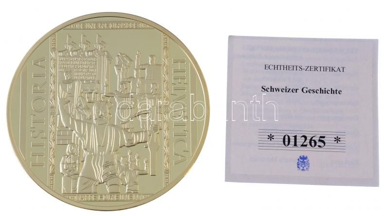 Svájc DN "Historia Helvetica / Marignanói csata 1515. szeptember 13./14." aranyozott fém emlékérem tanúsítvánnyal (70mm) T:PP