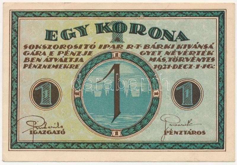 Budapest 1921. 1K "Sokszorosító Ipar Részvénytársaság" szüks... https://www.darabanth.com/de/403-Fernauktion/403.0/Numismatik/Notgeld-aus-Papier-und-Metall~2500006/Budapest-1921-1K-Sokszorosito-Ipar-Reszvenytarsasag-szuksegpenze-TIII-Adamo-BUC-2504~II2482592