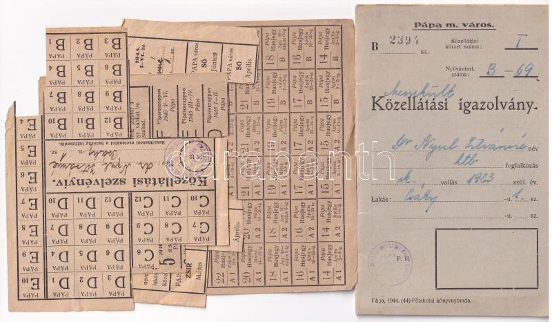 Beschreibung: Pápa ~1945. 4db-os élelmiszerjegy és közellátási szelvényív-tétel, közte 1db teljesen ép + 1944. "Közellátási igazolvány", kitöltött