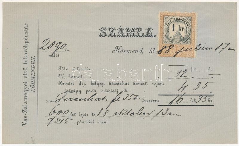 Beschreibung: Körmend 1888. "Vas-Zalamegyei első takarékpénztár Körmenden" kitöltött számla okmánybélyeggel T:III
