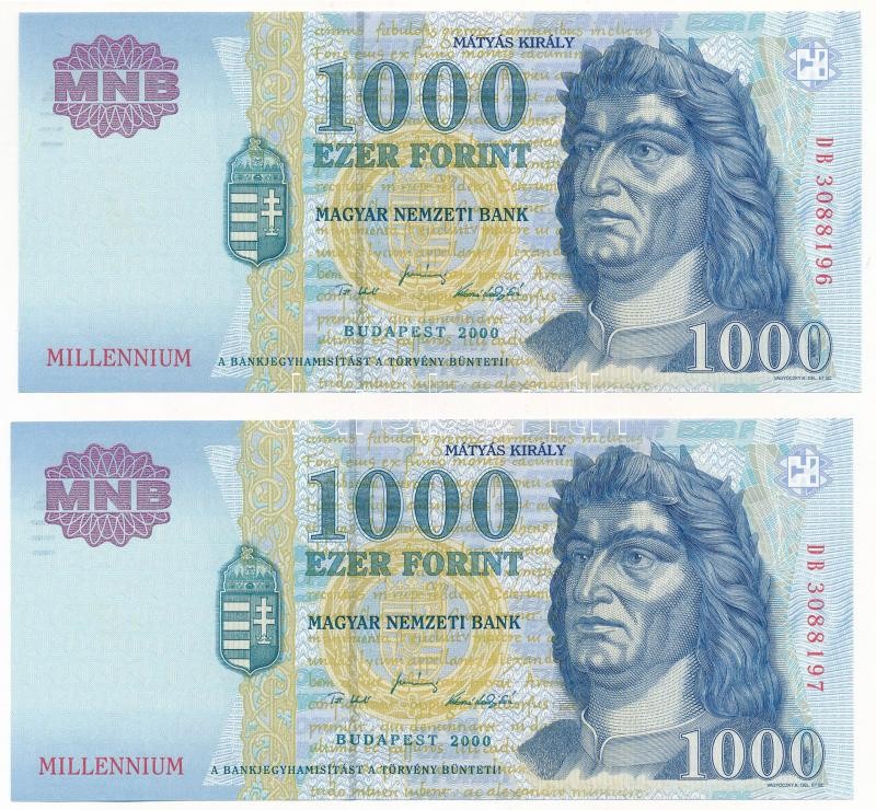 2000. 1000Ft (2x, sorszámkövetők "DB 3088196 - DB 3088197" &... https://www.darabanth.com/de/403-Fernauktion/403.0/Numismatik/Ungarische-Banknoten~2500007/2000-1000Ft-2x-sorszamkovetok-DB-3088196-DB-3088197-Millennium-TI-I-Adamo-F55B2~II2477312
