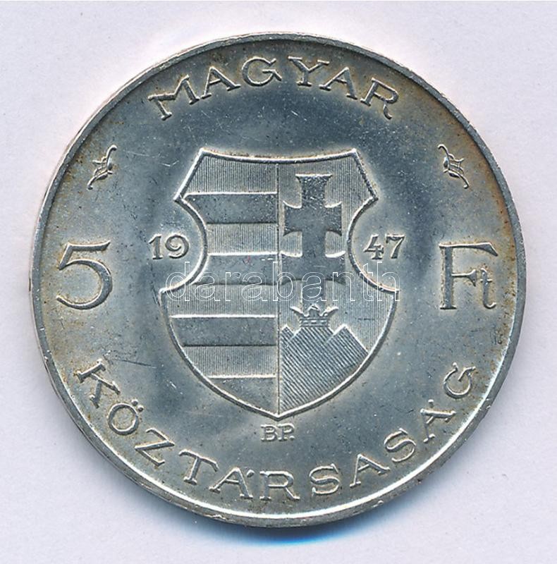 1947. 5Ft Ag "Kossuth" T:1- patina Adamo F8.1 https://www.darabanth.com/de/403-Fernauktion/403.0/Numismatik/Ungarische-Munzen-und-Munzen-mit-ungarischem-Munzzeichen~2500008/1947-5Ft-Ag-Kossuth-T1-patina-Adamo-F81~II2423329