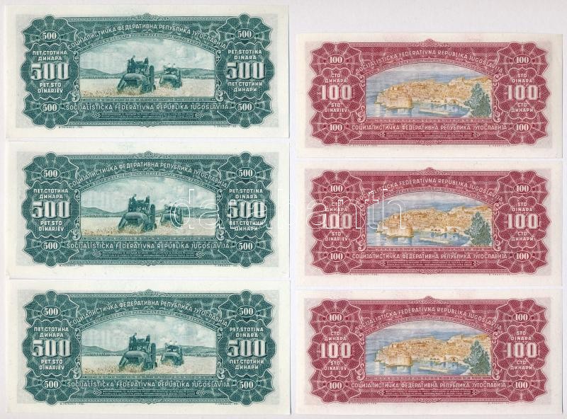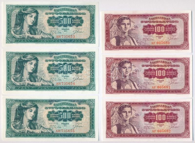 Beschreibung: Jugoszlávia 1963. 100D (3x) sorszámkövetők "AF 005680 - 005682" + 500D (3x) sorszámkövetők "AH 735653 - 735655" T:I