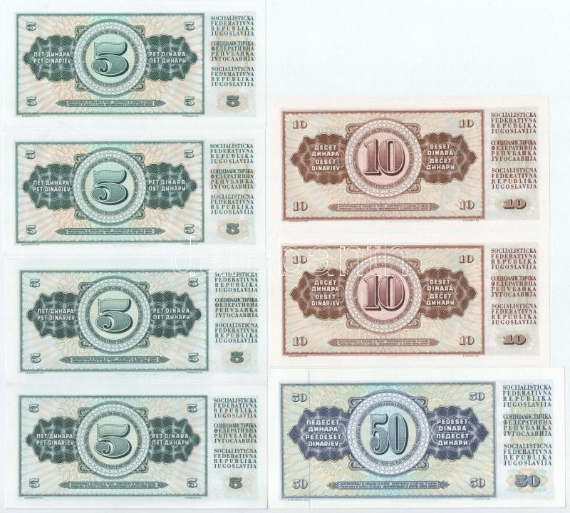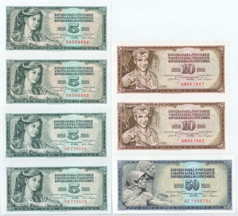 Yugoslavia 1968. 5 Dinara (2x) 2+2 consecutive serials, with different fonts "DA 068884 - 068885", "AH 770551 - 770552" + 10 Dinara (2x) + 50 Dinara C:UNC