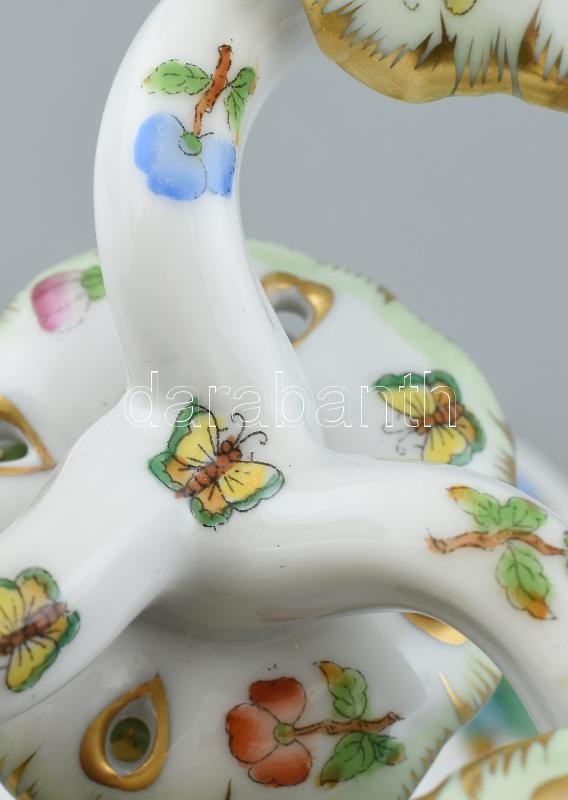 Beschreibung: Herendi Viktória mintás három ágú gyertyatartó. Kézzel festett, jelzett, hibátlan (gyertyaviasz nyomok találhatóak rajta). m: 23 cm