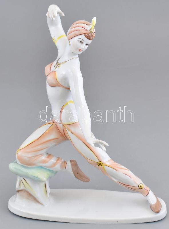 Beschreibung: Hollóházi porcelán táncosnő, kézzel festett, jelzett, hajdísze restaurált, m: 25 cm