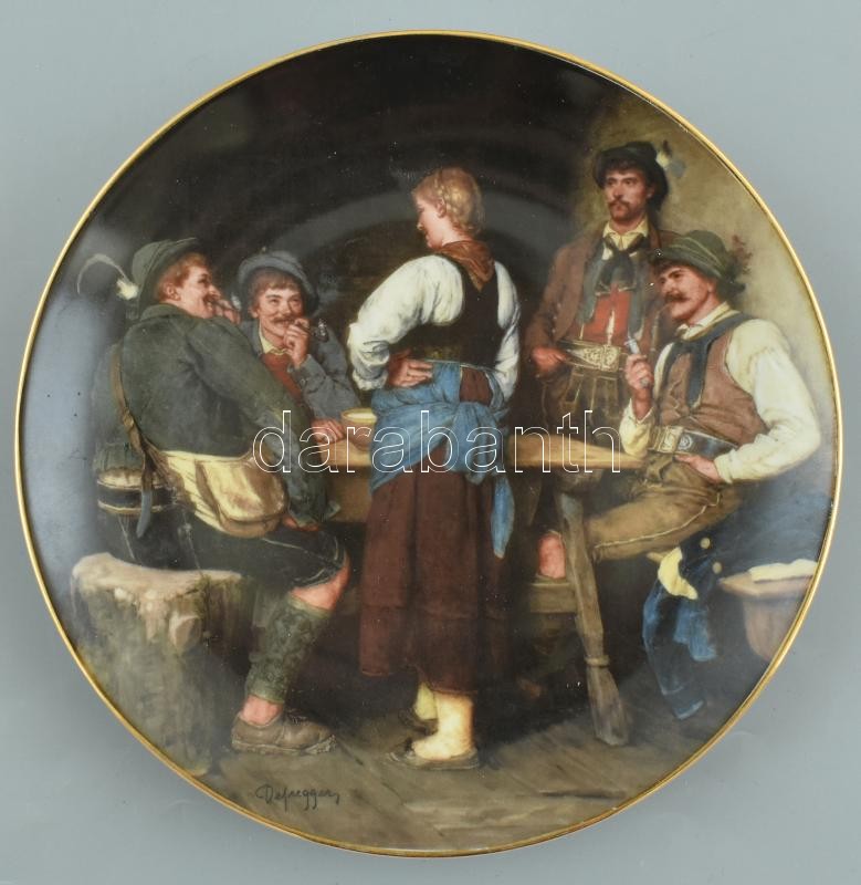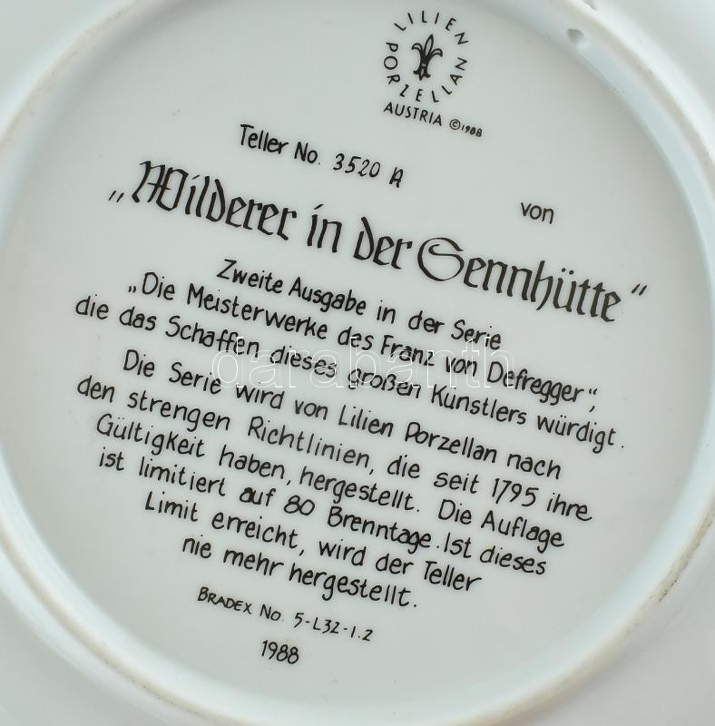 Lilien osztrák gyűjtői porcelán dísztányér, Franz von Defregger (1835-1921) festőművész képének mintájával ("Wilderer in der Sennhütte"). Levonóképes, jelzett, hátoldalán feliratozással és kézi sorszámozással, minimális kopással, d: 19,5 cm
