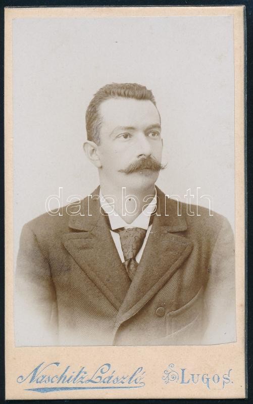 Beschreibung: 1896 Schieszler Antal számtiszt portréja, hátoldalán autográf ajándékozási sorokkal 1896-ból, keményhátú fotó Naschitz László lugosi műterméből, 10×6 cm