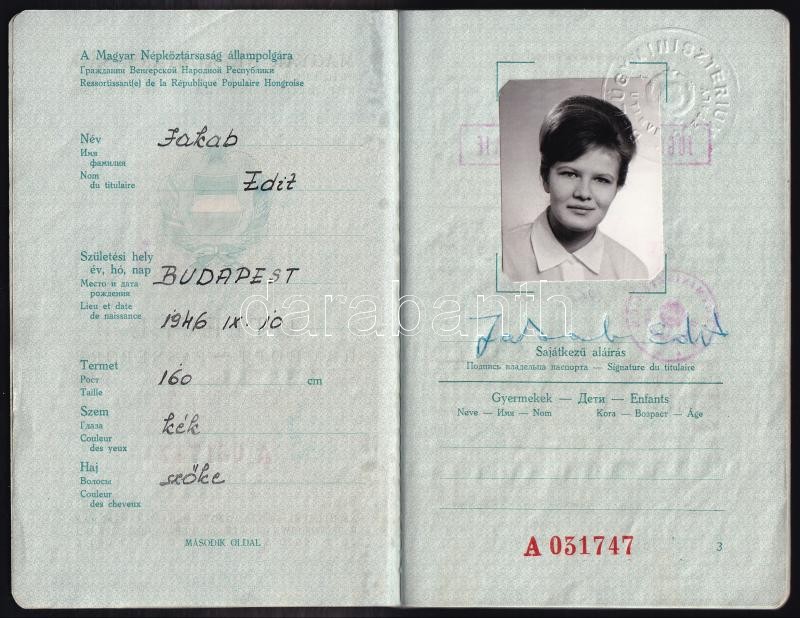 1964 Magyar Népköztársaság által kiállított kék útlevél nyugatra, vízu... https://www.darabanth.com/de/404-Fernauktion/404.0/Kunst-Dokumente-andere-Sammelgebiete/Dokument~500020/1964-Magyar-Nepkoztarsasag-altal-kiallitott-kek-utlevel-nyugatra-vizummal~II2492760