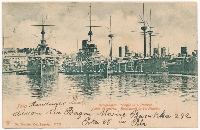 1902 K.u.K. Kriegsmarine Schiffe in I. Reserve, Kriegshafen / Bastimenti in I Riserva / Osztrák-Magyar Haditengerészet csatahajói Polában a tartalék kikötőben / Austro-Hungarian Navy battleships in the reserve dock near the Pula shipyard