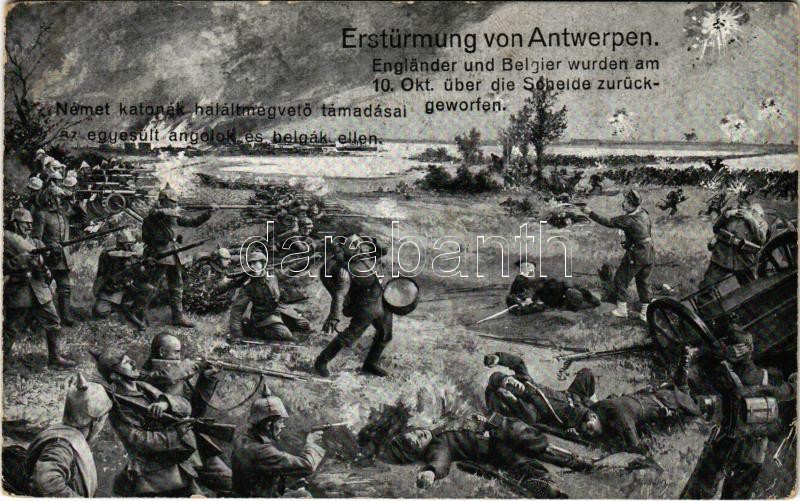 1915 Erstürmung von Antwerpen. Engländer und Belgier wurden am 10. Okt. über die Schelde zurückgeworfen / Német katonák halált megvető támadásai az egyesült angolok és belgák ellen / WWI German military art postcard (EK)