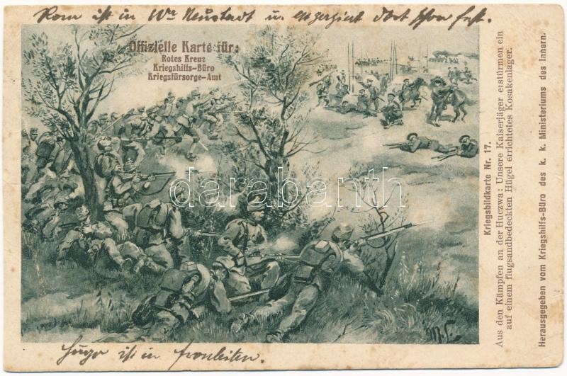 1915 Kriegsbildkarte Nr. 17. Aus den Kämpfen an der Huczwa: Unsere Käiserjäger erstürmen ein auf einem flugsandbedeckten Hügel errichtetes Kosakenlager. Kriegshilfsbüro / WWI Austro-Hungarian K.u.K. military art postcard. From the battles along the Khuchva river. s: M. Ledeli (EB)