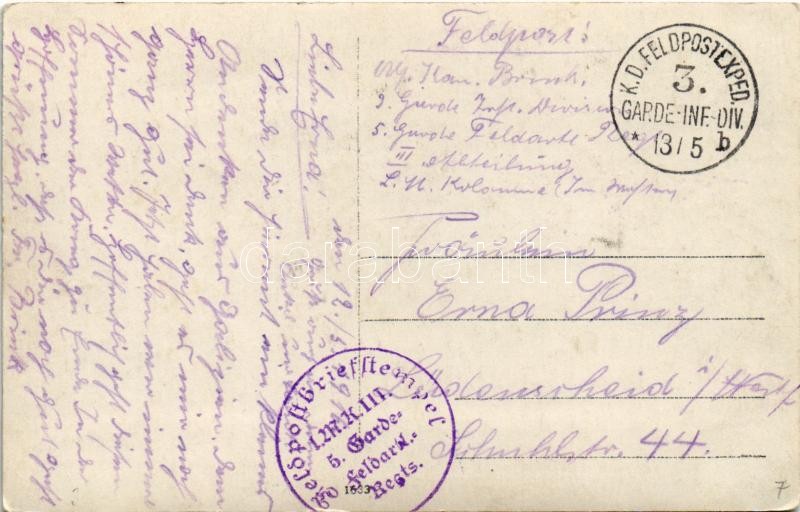 Beschreibung: 1916 WWI German military, group of soldiers. photo + "L.M.K. III. 5. Garde-Feldartl.-Regts. Feldpostbriefstempel"