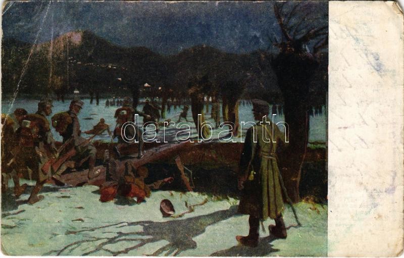 1917 A 30. honvéd gyalogezred éjjeli támadása 1914. november 27-ről 28-ra a Kamalj hegyre a Kacer völgyön át. A budapesti 30. honvéd gyalogezred özvegy- és árvaalapja javára kiadja az ezred pótzászlóalja. Rigler r.-t. / WWI Austro-Hungarian K.u.K. military art postcard s: Juszkó Béla + "M. kir. budapesti 30. honvéd gyalogezred" (EM)