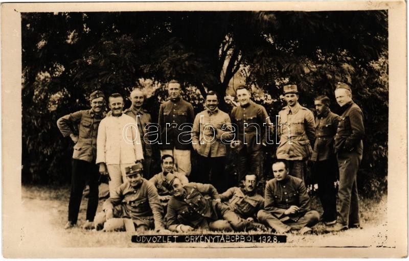 1928 Üdvözlet az Örkénytáborból, katonák csoportképe. photo (ragasztón... https://www.darabanth.com/de/405-Fernauktion/405.0/Ansichtskarten/Militaria~1000079/1928-Udvozlet-az-Orkenytaborbol-katonak-csoportkepe-photo-ragasztonyom-gluemark~II2503833