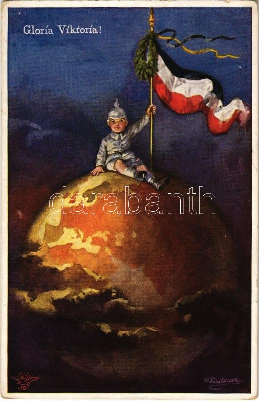Gloria Viktoria! / WWI German military art postcard, soldier boy with German flag, patriotic propaganda. Wohlgemuth & Lissner No. 1064. "Die Flammenzeichen rauchen" s: W. Fialkowska (EK)