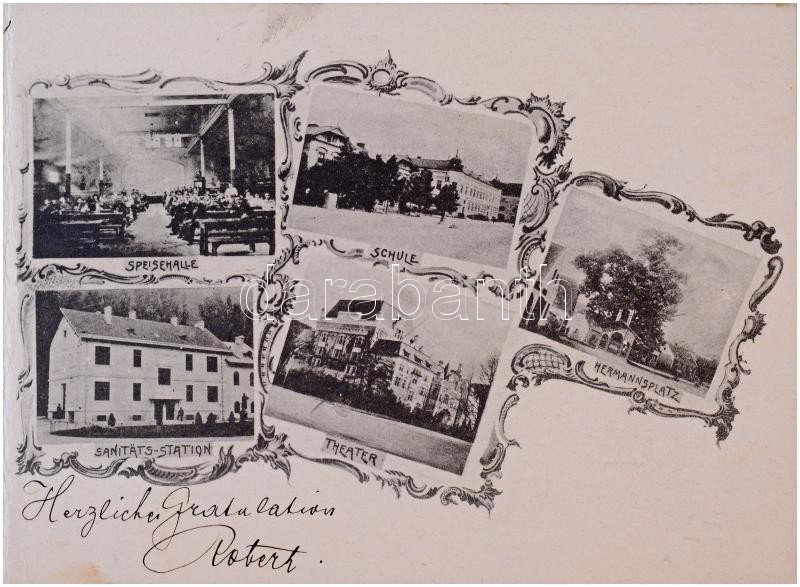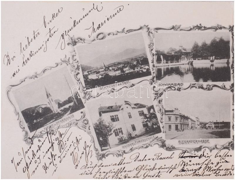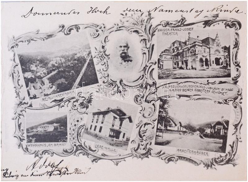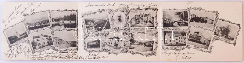 1900 Berndorf an der Triesting, Kirche, Schwimmbad, Metallwarenfabrik, Lese-Halle, Arbeiterhäuser, Kaiser Franz Josef Theater, Speisehalle, Schule, Hermannsplatz, Alexandergasse, Haushaltungsschule. 3-tiled folding postcard, Art Nouveau, floral