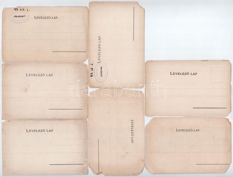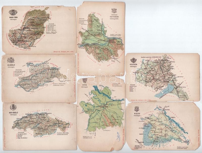 7 db RÉGI magyar motívum képeslap sarokhiányokkal: Károlyi Gy. vármegye térképek (Maros-Torda, Kis-Küküllő, Nagy-Küküllő, Veszprém, Esztergom, Győr, Moson) / 7 pre-1900 Hungarian motive postcards with corner shortages: county maps from the Kingdom of Hungary (Mures-Turda, Tarnava-Mica, Tarnava-Mare, Veszprém, Esztergom, Győr, Moson)