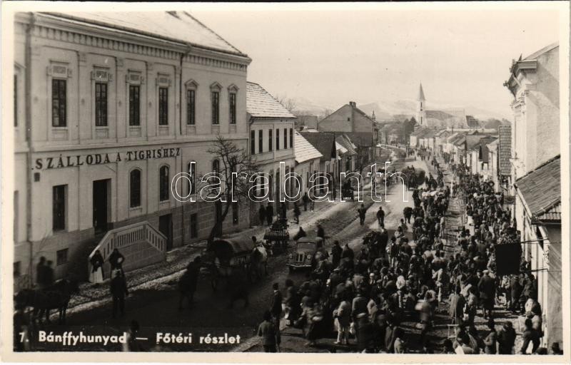Beschreibung: Bánffyhunyad, Huedin; Fő tér télen, Szálloda a Tigrishez, Gál Ferenc üzlete, tömeg / main square in winter, hotel, shops, crowd