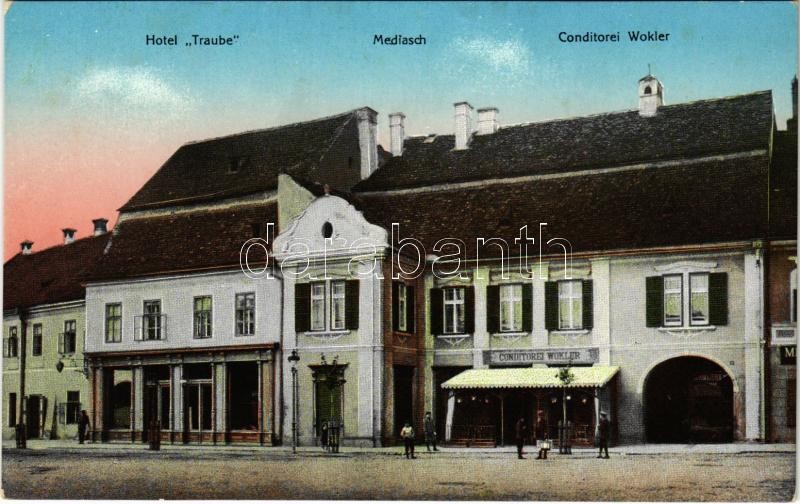 Beschreibung: Medgyes, Mediasch, Medias; Hotel Traube, Conditorei Wokler / Traube szálloda, Wokler cukrászda. Kiadja Fritz Guggenberger / hotel, confectionery, pastry shop