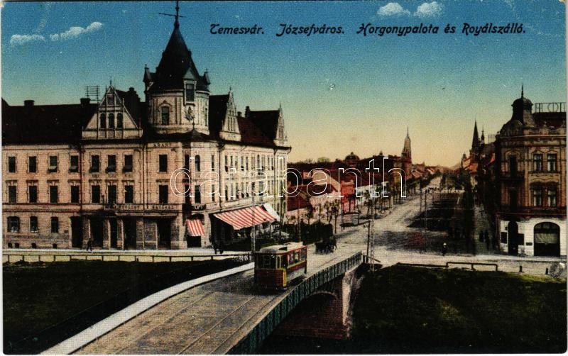 Beschreibung: Temesvár, Timisoara; Józsefváros, Horgony palota és kávéház, Royal szálló, villamos / Iosefin, palace, café, hotel, tram