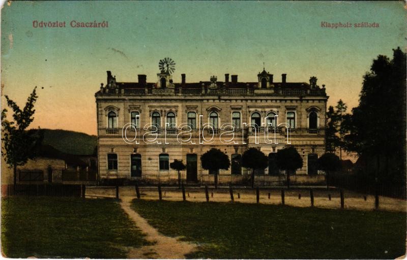 1912 Csaca, Csacza, Cadca, Caca; Klappholz szálloda / hotel + "OD... https://www.darabanth.com/de/405-Fernauktion/405.0/Ansichtskarten/Slowakei~1000003/1912-Csaca-Csacza-Cadca-Caca-Klappholz-szalloda-hotel-plus-ODERBERG-GALANTA-BUDAPEST-362-vasC3~II2503010