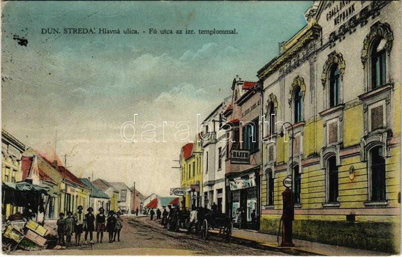 1915 Dunaszerdahely, Dunajská Streda; Fő utca, izraelita templom, zsinagóga, Csallóközi Népbank, Elite divatáruház, Kobrak üzlete, piac. Petényi Márk kiadása / main street, synagogue, shops, bank, market (EK)