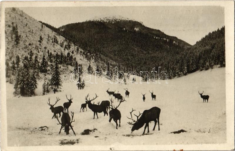 Javorina, Jaworzyna Spiska, Tatranská Javorina (Tátra, Magas Tátra, Vysoké Tatry); Krimenie v Javorine / Fütterung in Uhrngarten / Szarvas etetés Javorinán / deer feeding in the High Tatras. E. Moravetz No. 350. (apró lyuk / tiny hole)