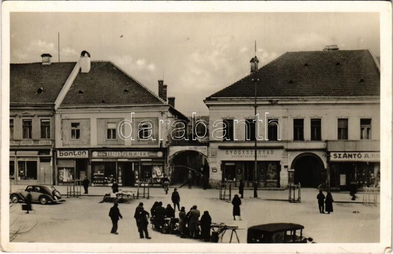 Rozsnyó, Roznava; Rákóczi tér, Szántó A. és társa, Banton divatáruház, Tatra Drogueria, Gyógyszertár a Szentháromsághoz, piac / square, shops, pharmacy, drugstore, market (fl)