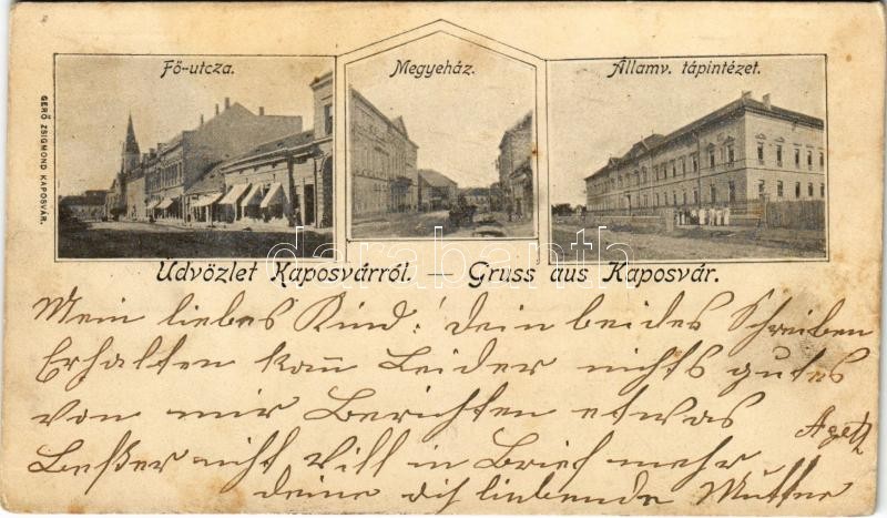 Beschreibung: 1898 (Vorläufer) Kaposvár, Fő utca, megyeház, Államvasúti tápintézet. Gerő Zsigmond kiadása (EK)