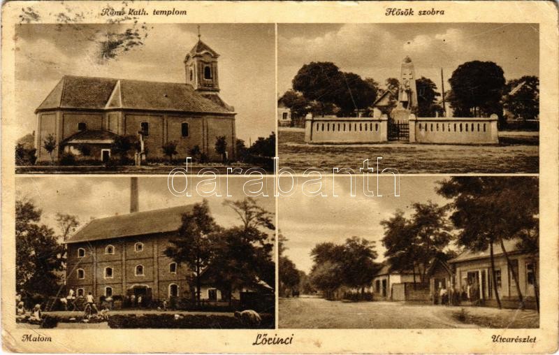 Beschreibung: 1938 Lőrinci, Római katolikus templom, Hősök szobra, emlékmű, utca részlet, üzlet, Malom (EB)