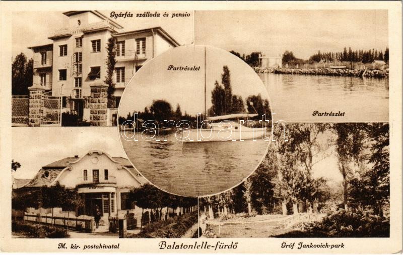 Beschreibung: Balatonlelle-fürdő, M. kir. postahivatal, part, Gyárfás szálloda és pensio, Gróf Jankovich park