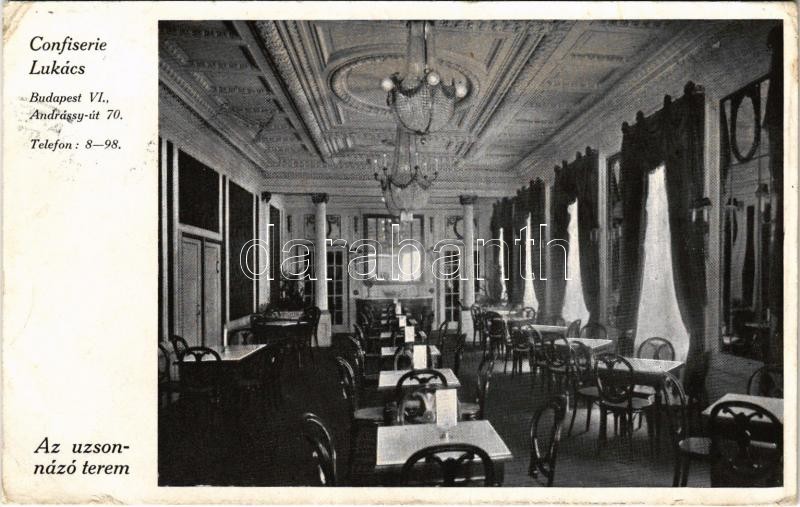 Budapest VI. Confiserie Lukács Cukrászda, Uzsonnázó terem, belső. Andr... https://www.darabanth.com/de/405-Fernauktion/405.0/Ansichtskarten/Ungarn~1000001/Budapest-VI-Confiserie-Lukacs-Cukraszda-Uzsonnazo-terem-belso-Andrassy-ut-70-EK~II2503881