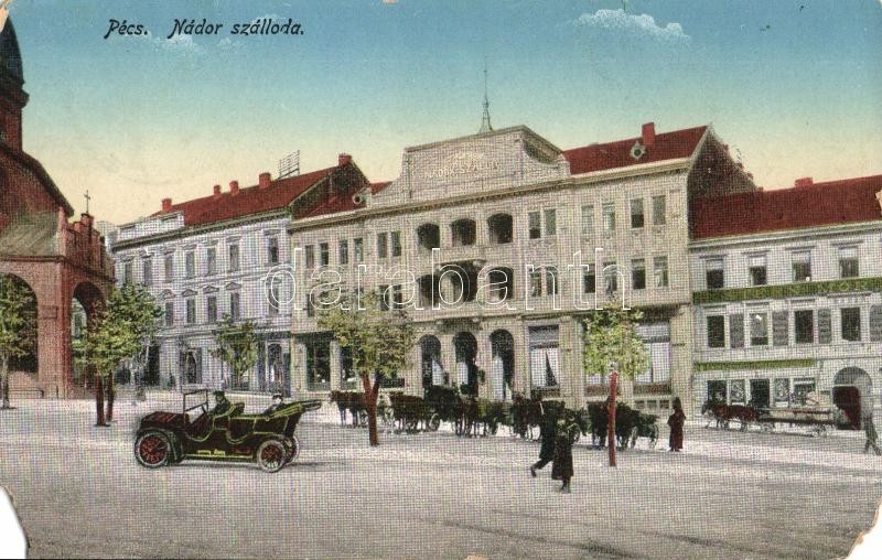 Beschreibung: Pécs, Nádor szálloda, automobil, Stern Mór üzlete (EM)