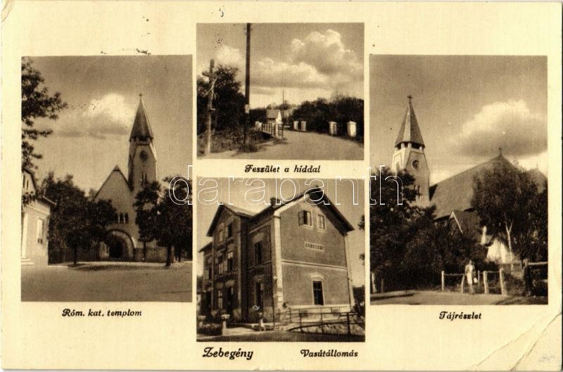 Beschreibung: Zebegény, Római katolikus templom, feszület a híddal, táj, Vasútállomás (EB)