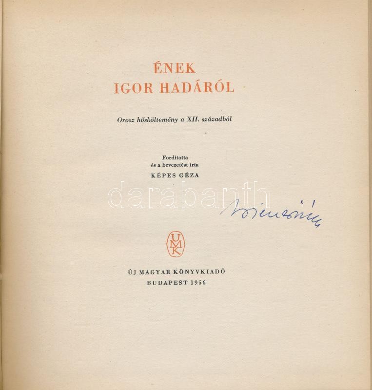 Ének Igor hadáról. Orosz hősköltemény a XII. századból. Ford. és a bevezetést írta: Képes Géza. Bp., 1956, Új Magyar Könyvkiadó. Kiadói kartonált papírkötés, kiadói foltos papír védőborítóban. Megjelent 1800 példányban. Dienes István (1929-1995) régész, muzeológus névbejegyzésével.