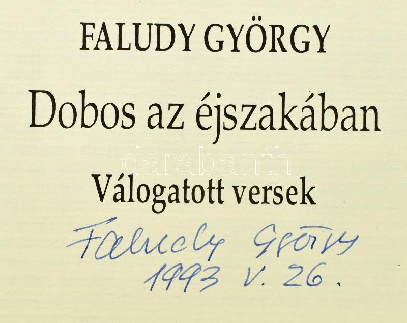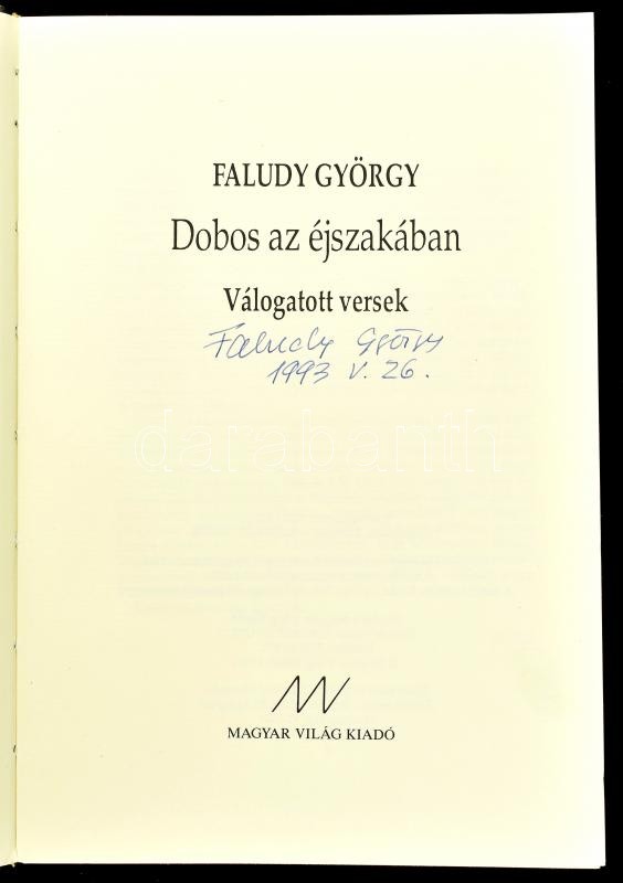 Faludy György: Dobos az éjszakában. Aláírt példány. Bp., 1992. Magyar ... https://www.darabanth.com/de/405-Fernauktion/405.0/Bucher/Bucher-Andere-kuriositaten~2000019/Faludy-Gyorgy-Dobos-az-ejszakaban-Alairt-peldany-Bp-1992-Magyar-Vilag-Kiadoi-papikr~II2503747
