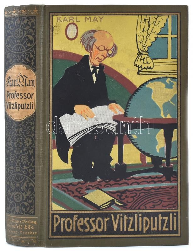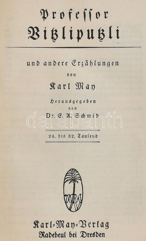 May, Karl: Professor Vitzliputzli und andere Erzählungen. Herausgegeben von Dr. E. A. Schmid. Karl May's Gesammelte Werke Band 47. Radebeul, 1927, Karl-May-Verlag, 518+2 p. Német nyelven. Kiadói aranyozott, festett egészvászon-kötés, a borÃtón kis kopásnyomokkal, helyenként kissé foltos lapokkal.